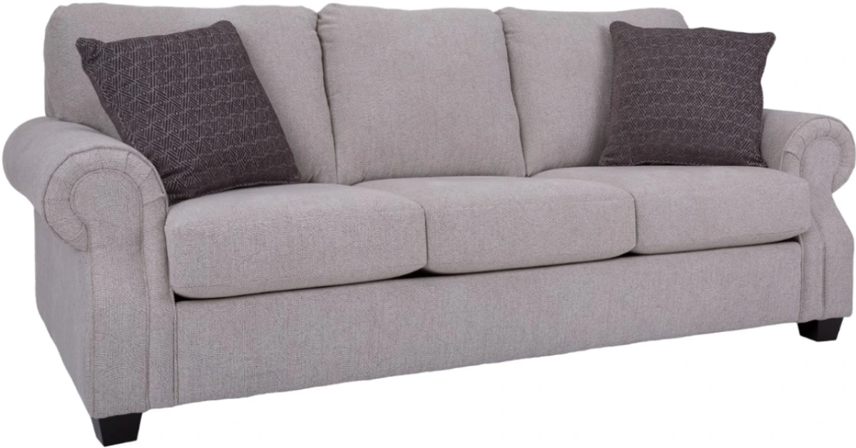 This traditional sofa set has a rolled arm with optional nail studs and semi-attached back. Available as a sofa, loveseat, chair, ottoman and also comes a queen bed. Made by Canadian upholstery artisans.Read More