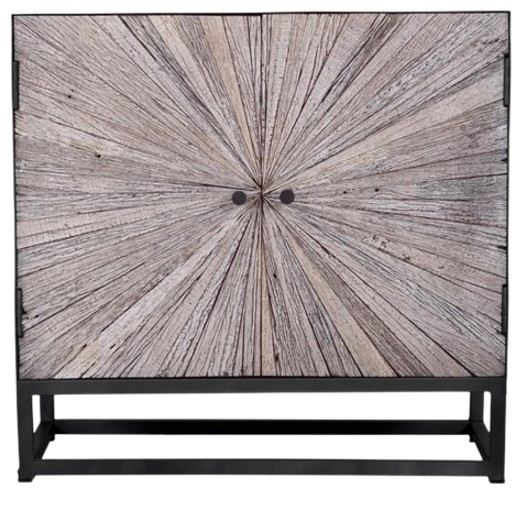 Eye-catching, the dramatic wood starburst pattern on the door fronts are masterfully cut and hand-placed to create an organic and textured look. This piece is balanced out with a grey surround and metal base.Read More